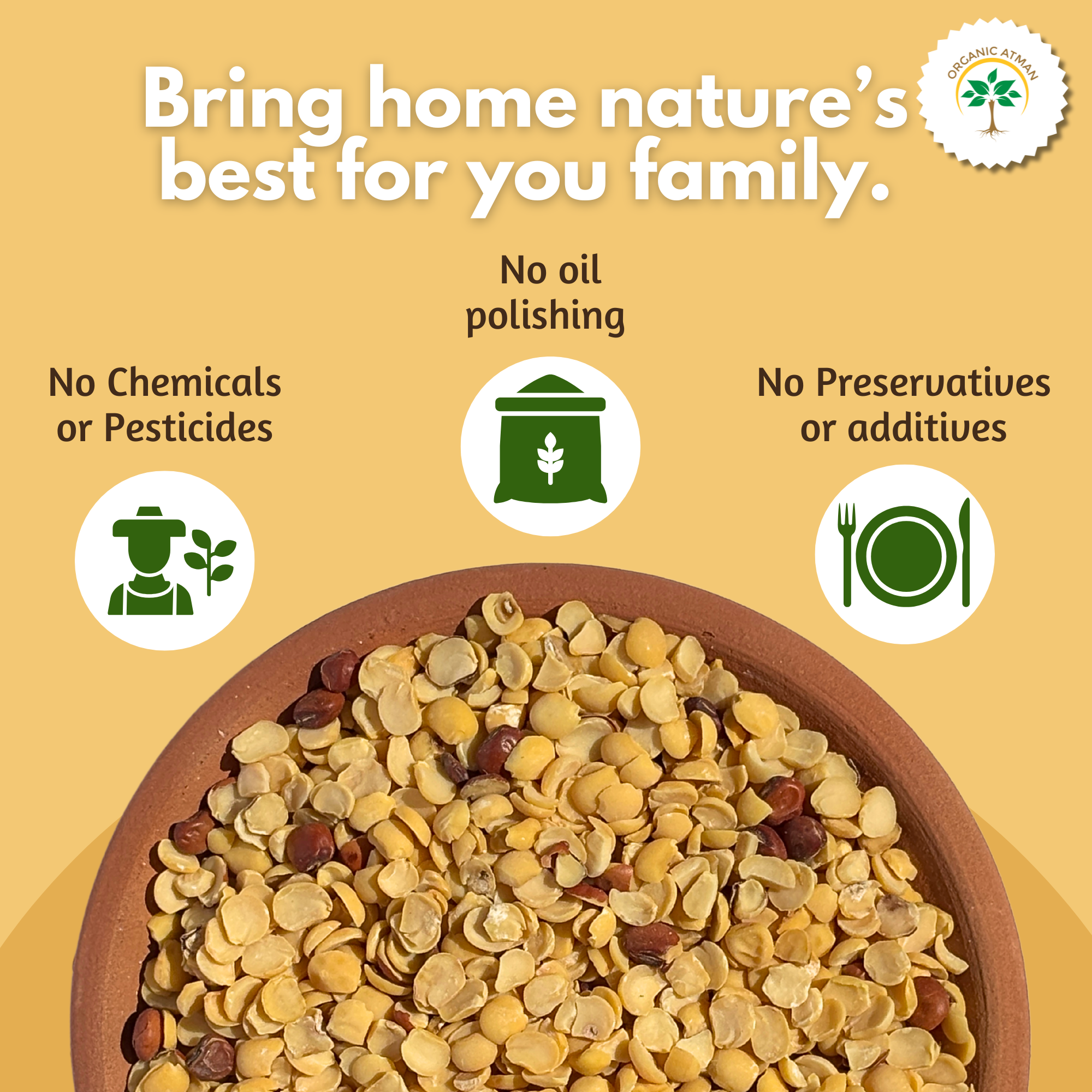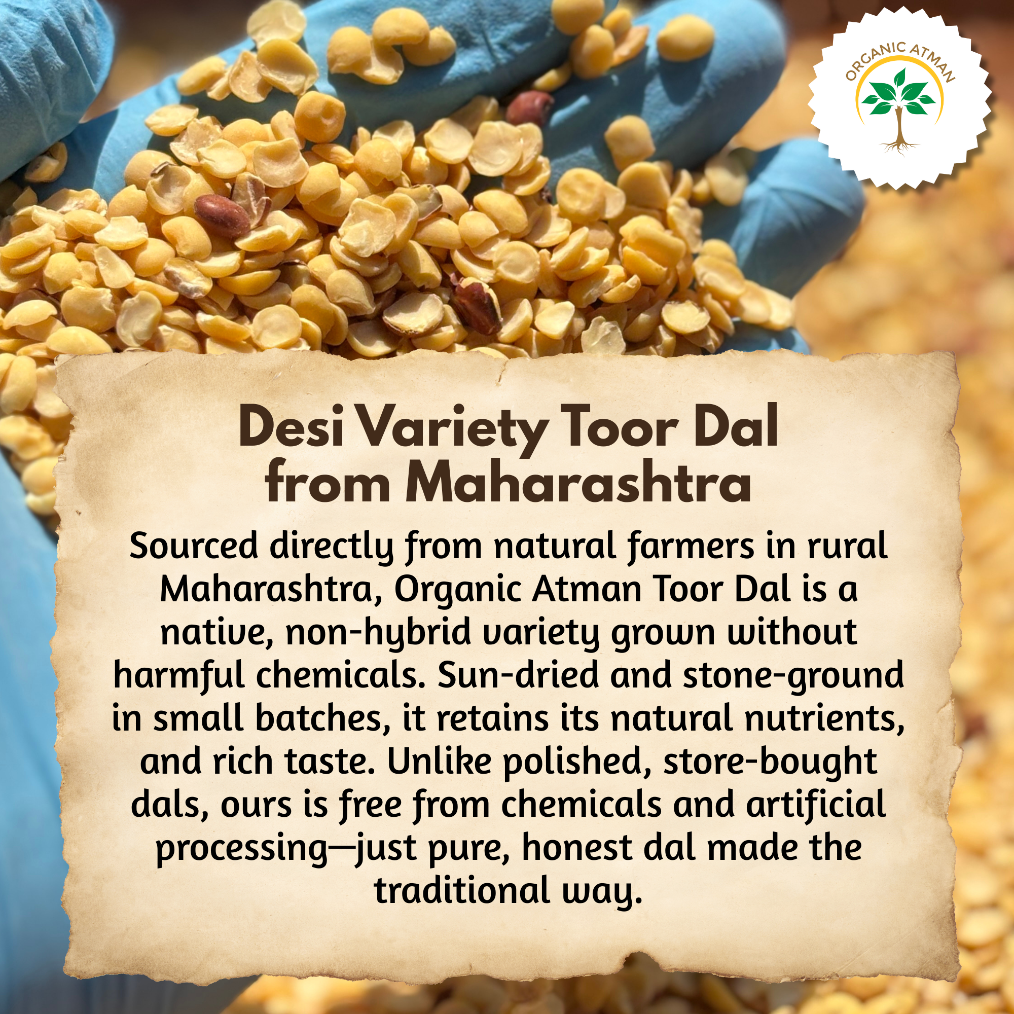 Organic Atman Desi Unpolished Toor Dal also known as Arhar Dal/ Tur Dal/ Tuvar Dal/ Split Pigeon Peas is hand milled using a traditional stone mill by our rural woman team. It is highly nutritious, rich in protein and easy to digest. A staple legume found in Indian cuisine, Toor dal (pigeon peas) is used to make dishes like yellow dal, varan, sambhar and puran poli amongst other dishes.